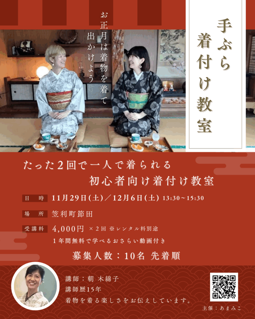節田では、着付け講師の朝木綿子(あさゆうこ)さんによる初心者向けの着付け教室も開催されます。テーマは「お正月は着物を着て出かけよう」。