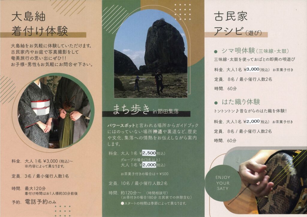 A. 島唄体験・織り体験・着付け体験は室内で行うため、雨天でも実施可能です。集落歩き(まち歩き)は、雨の状況によってルートを短縮したり、屋内でのご案内に変更したりする場合があります。悪天候が予想される際は、事前に実施可否をご案内します。